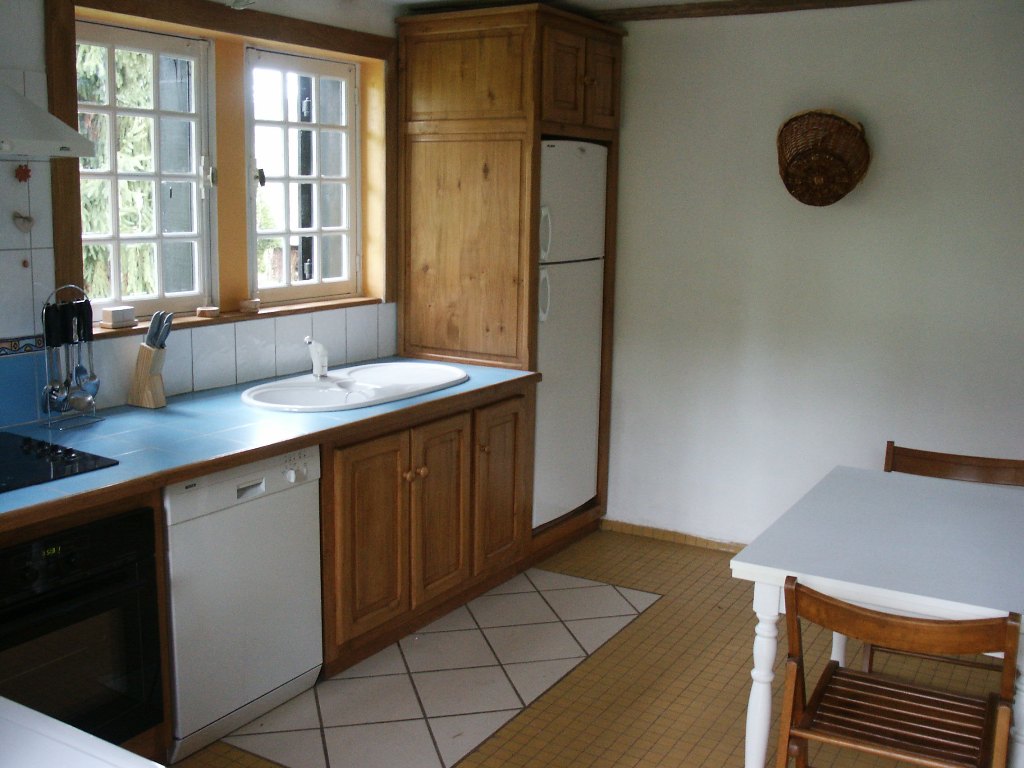 Cuisine aménagée de 14 m2 avec table et chaises, comprenant four électrique, plaques vitro-céramiques, micro-onde, toaster, cafetière, lave-vaisselle, réfrigérateur avec compartiment congélation, meubles de cuisine avec ustensiles