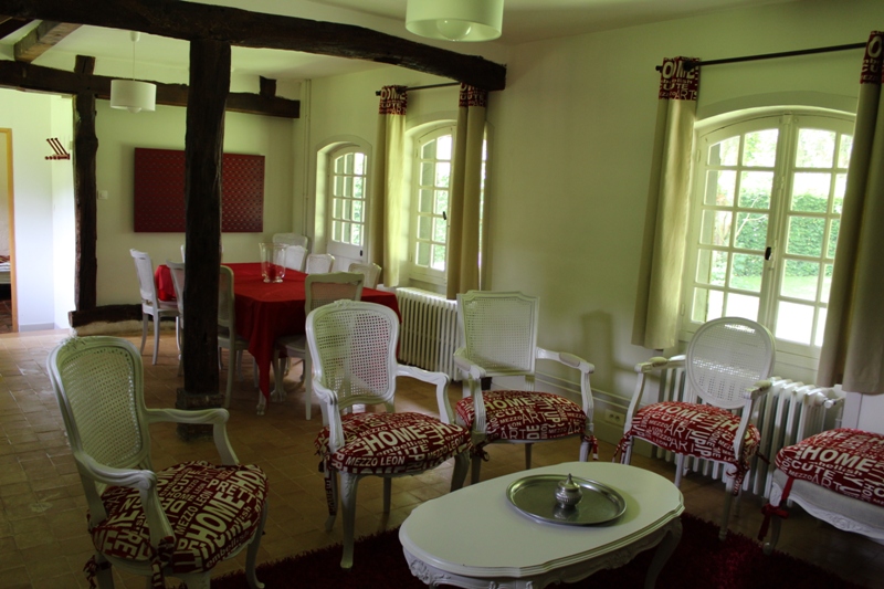 Salon avec canapé et fauteuils, écran plat chaînes TNT, lecteur DVD, chaîne Hifi, connexion internet.